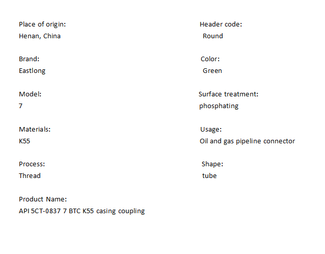 The main thread types of casing coupling are: long round thread casing coupling (LC), short round thread casing coupling (SC), buttress thread casing coupling (BC), and the main steel types are :J55, K55, N80, L80, P110 Wait.
