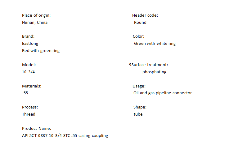 The main thread types of casing coupling are: long round thread casing coupling (LC), short round thread casing coupling (SC), buttress thread casing coupling (BC), and the main steel types are :J55, K55, N80, L80, P110 Wait.